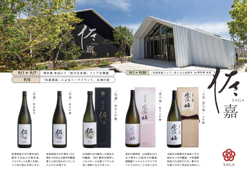また、9月5日(金)には、「佐嘉酒造」によるトークイベント「お酒の会」も開催いたします。杜氏の方から直接、日本酒へのこだわりや楽しみ方についてお話を伺える貴重な機会です。