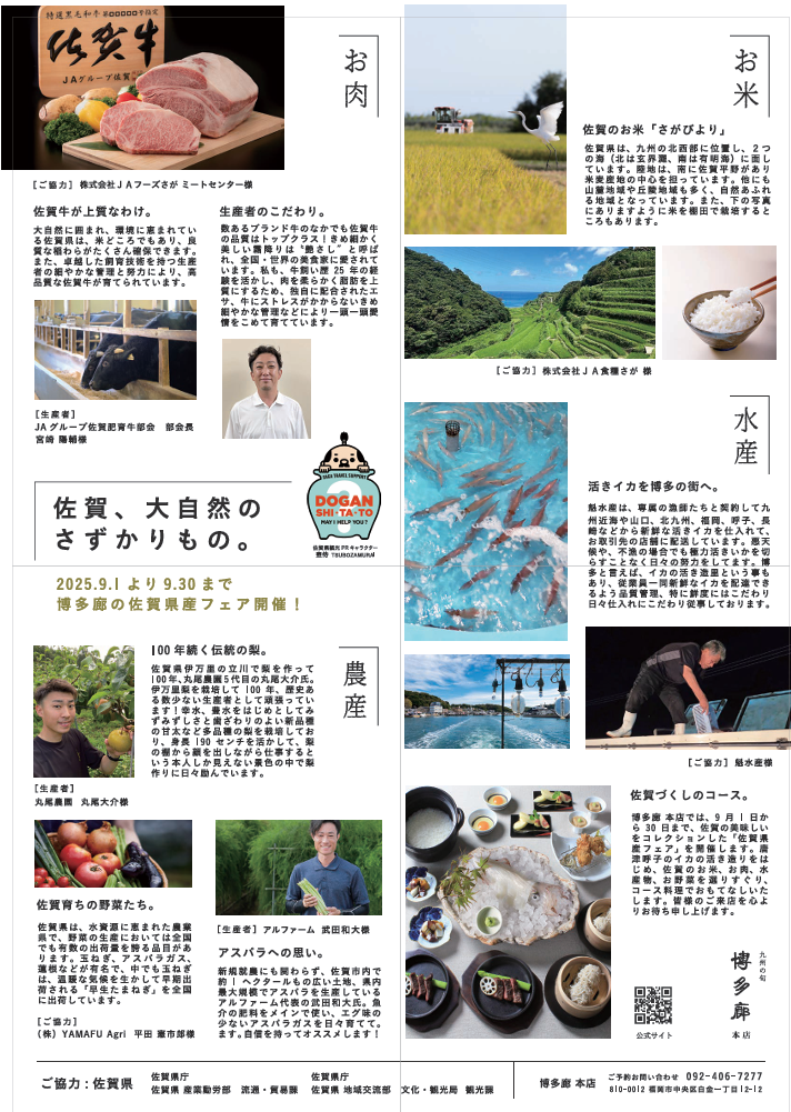 博多廊本店では、9月1日(月)から9月30日(火)までの期間、「佐賀県フェア」を開催いたします。佐賀県が誇る豊かな大地の恵みを、博多廊の職人が丹精込めてご提供します。